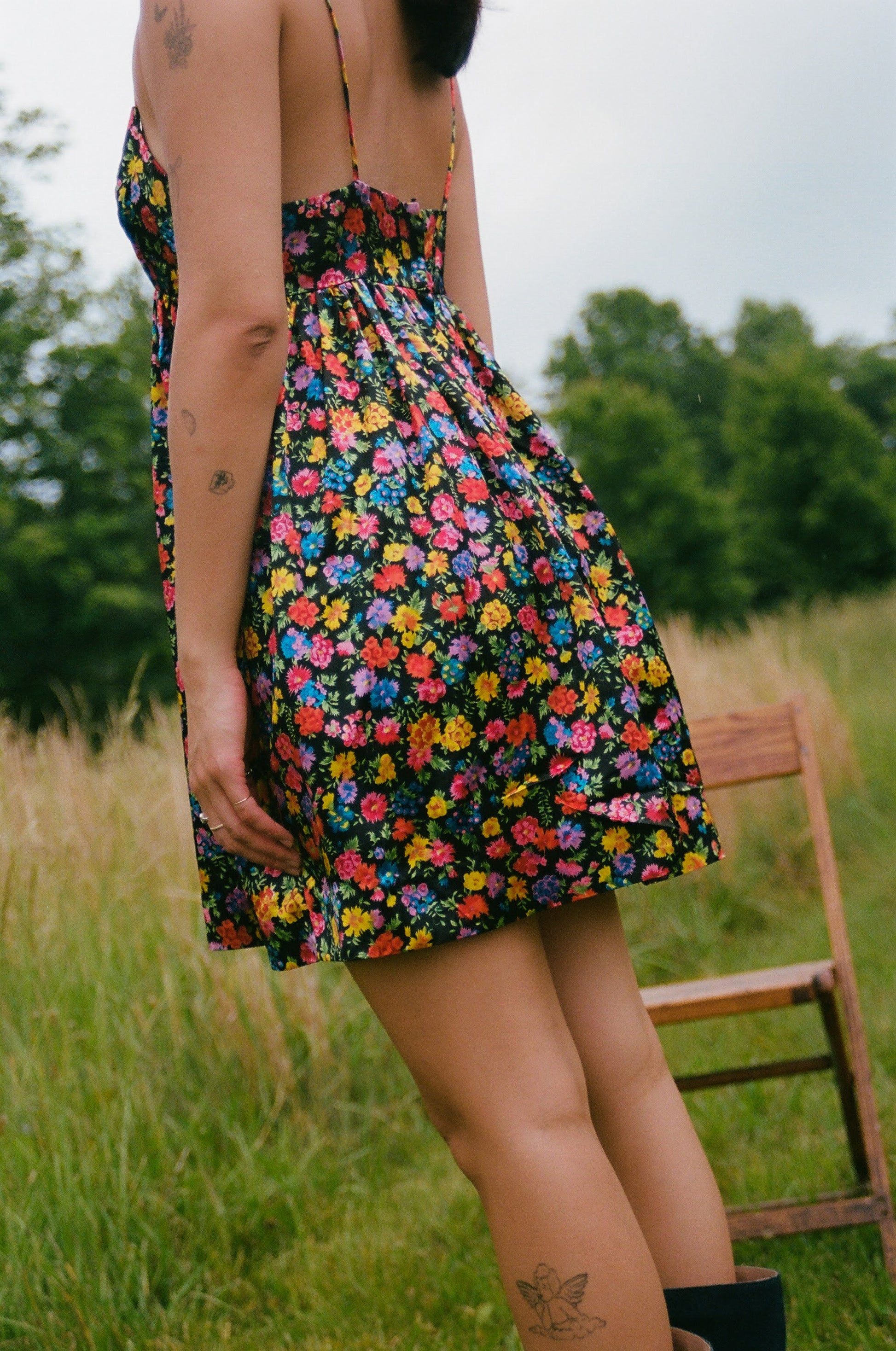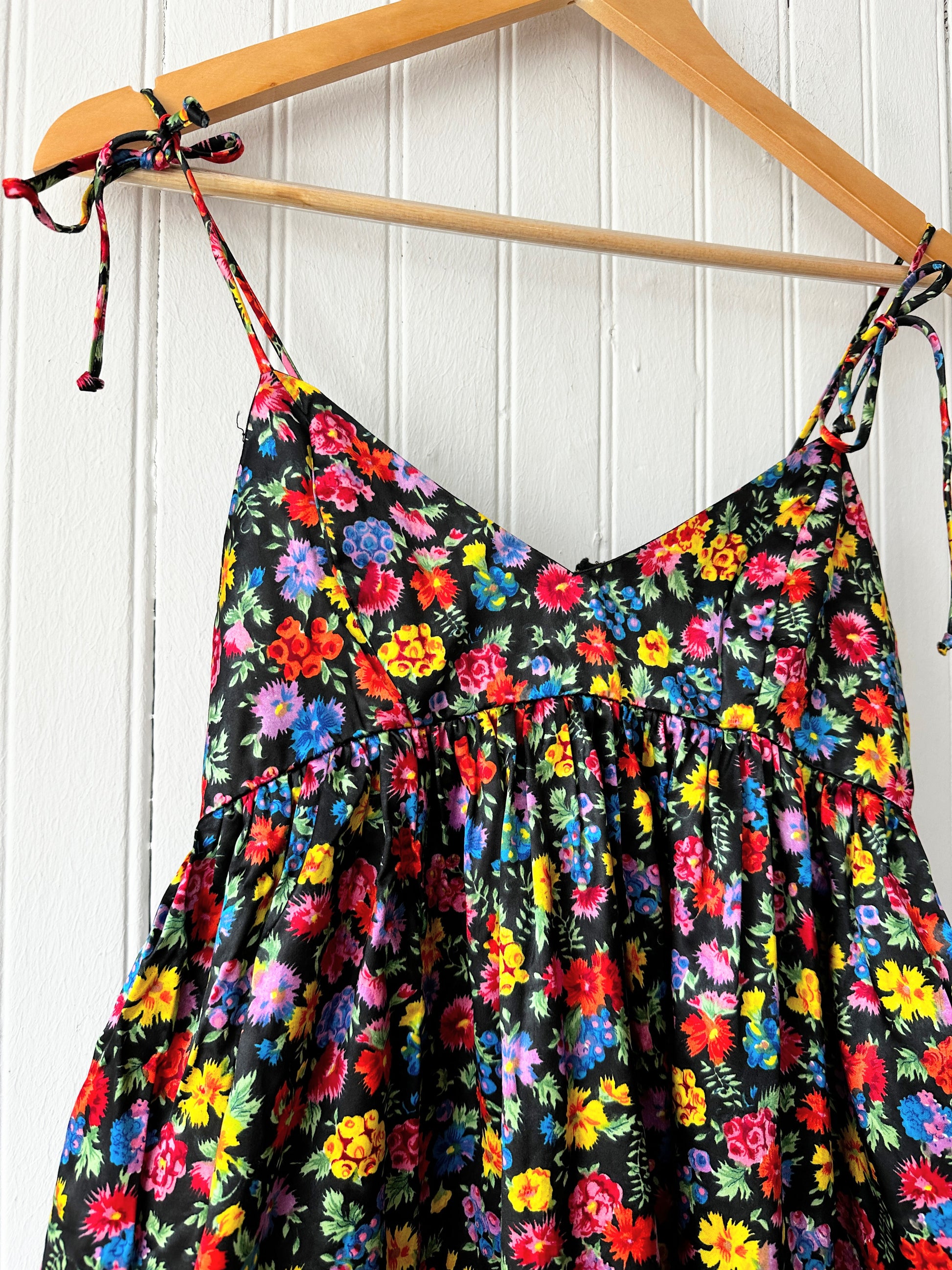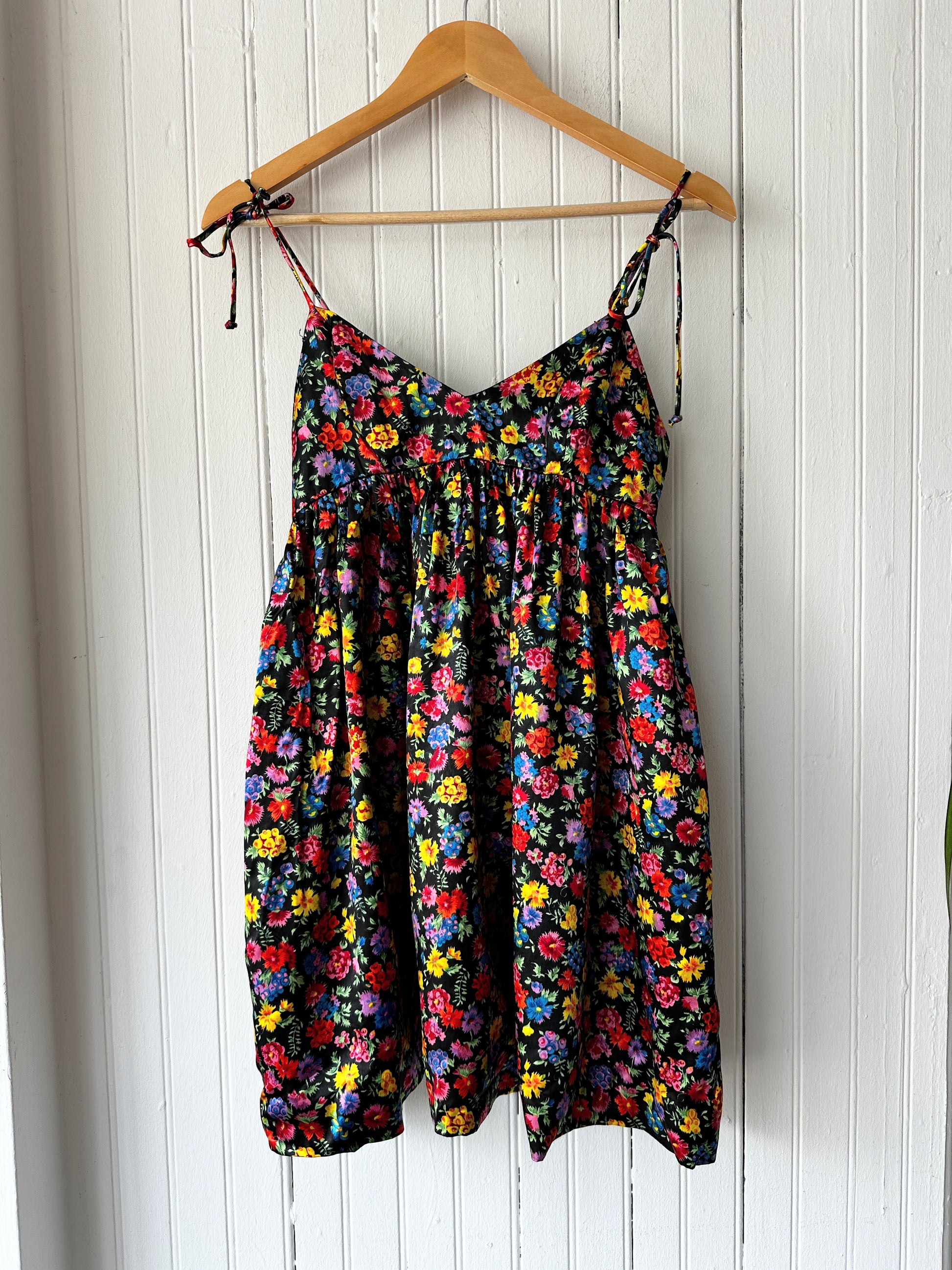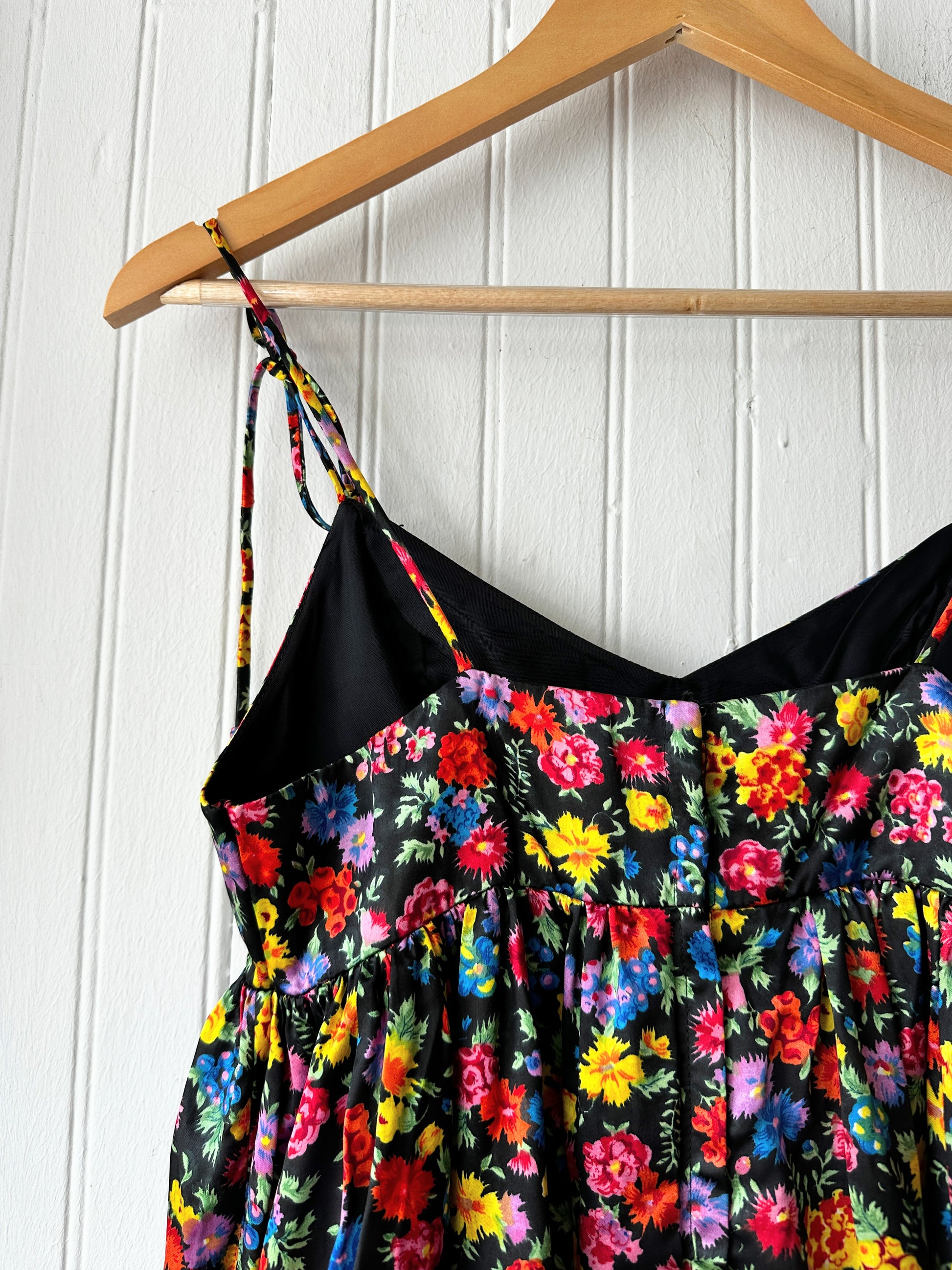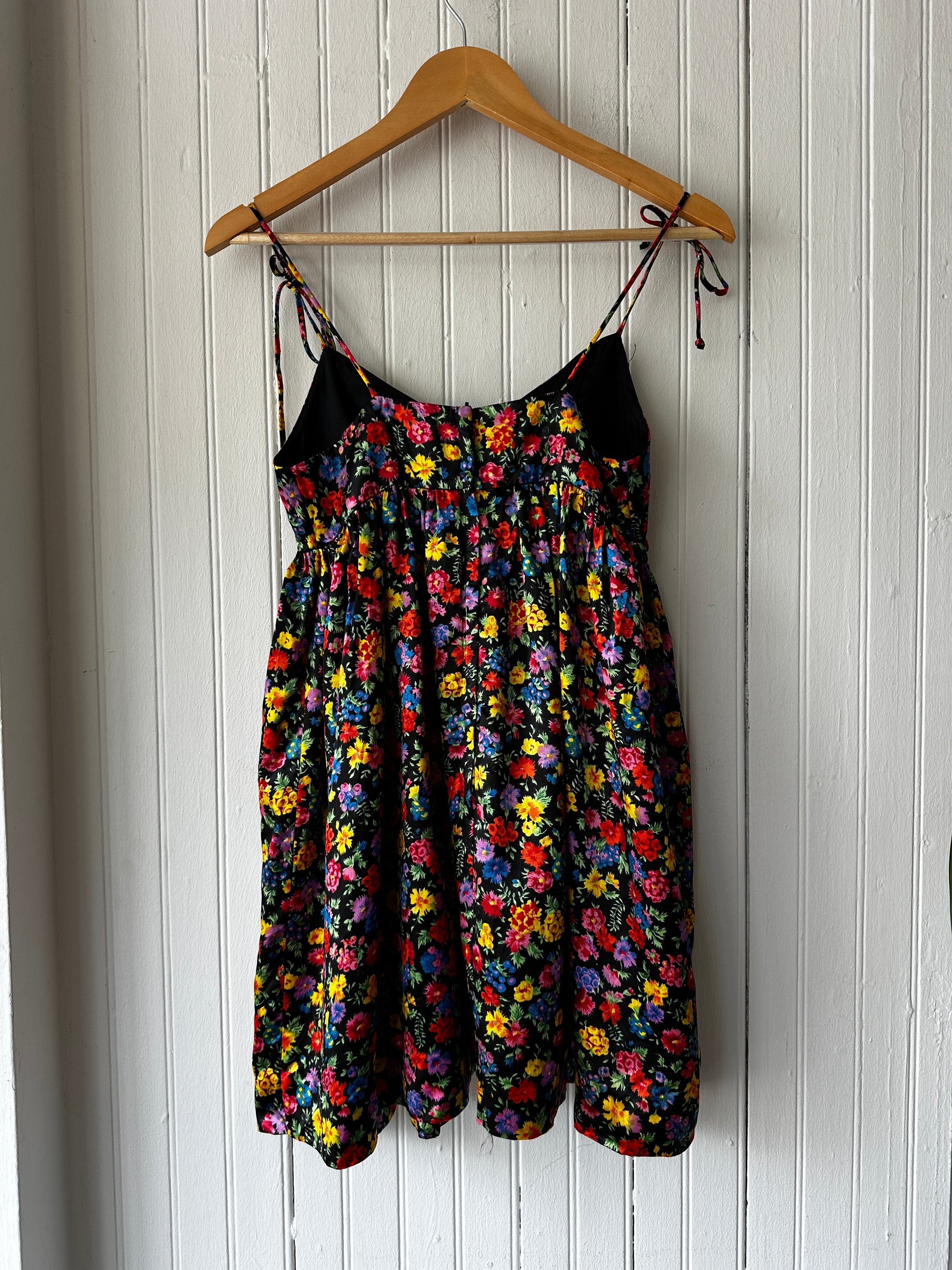 This piece is incredible--truly transcends era's but is an original 70's mini dress with vibrant floral print and tie straps along the shoulder and back zipper.