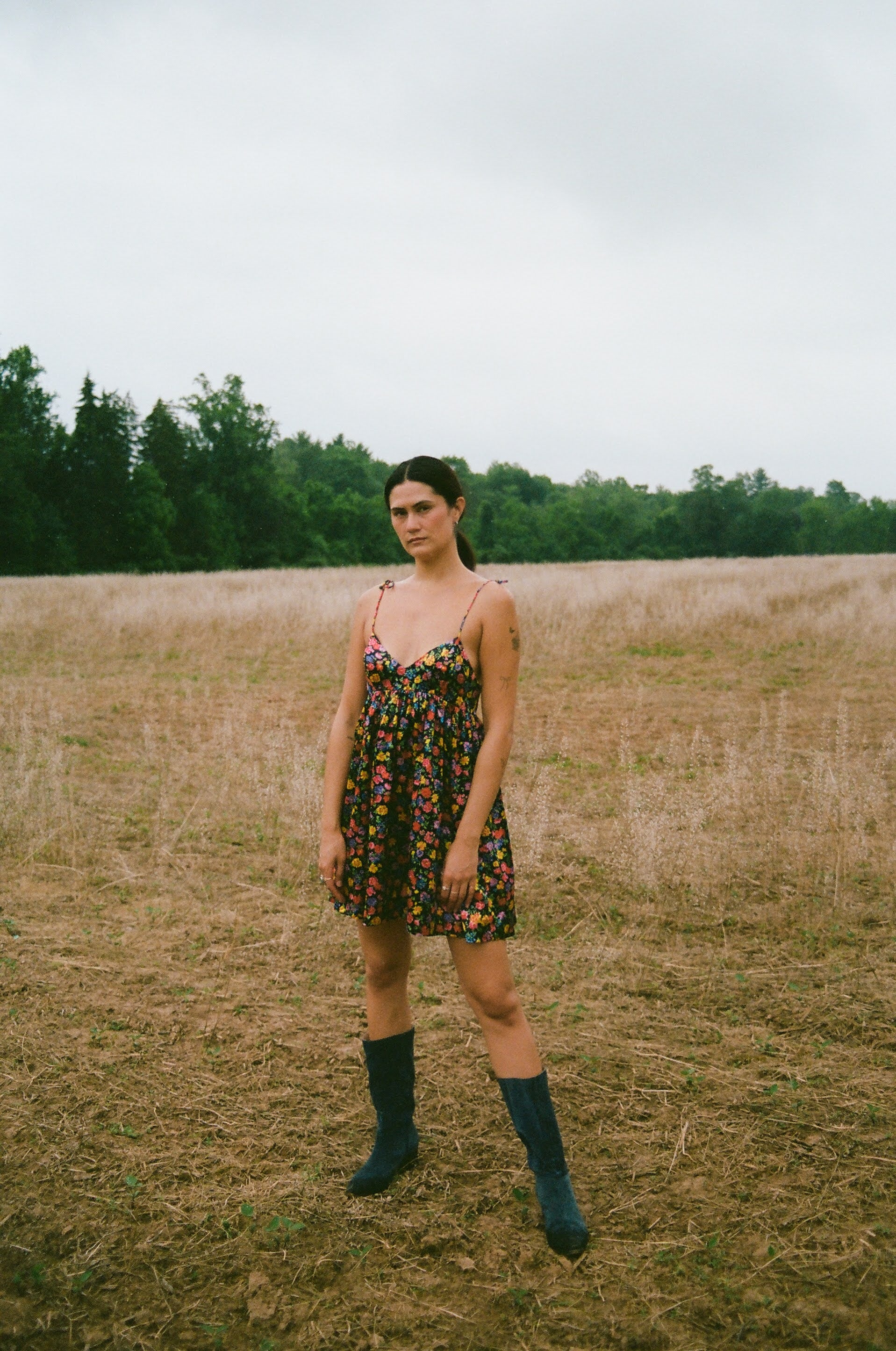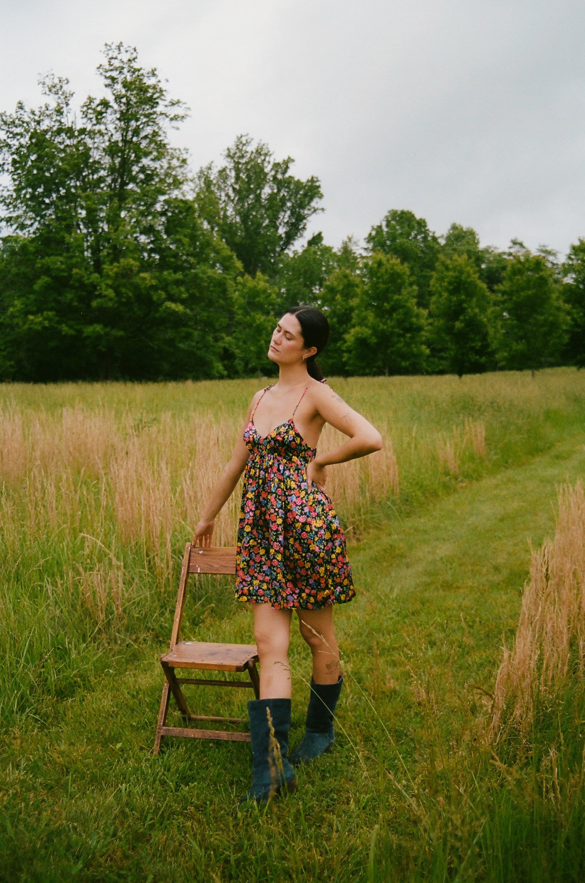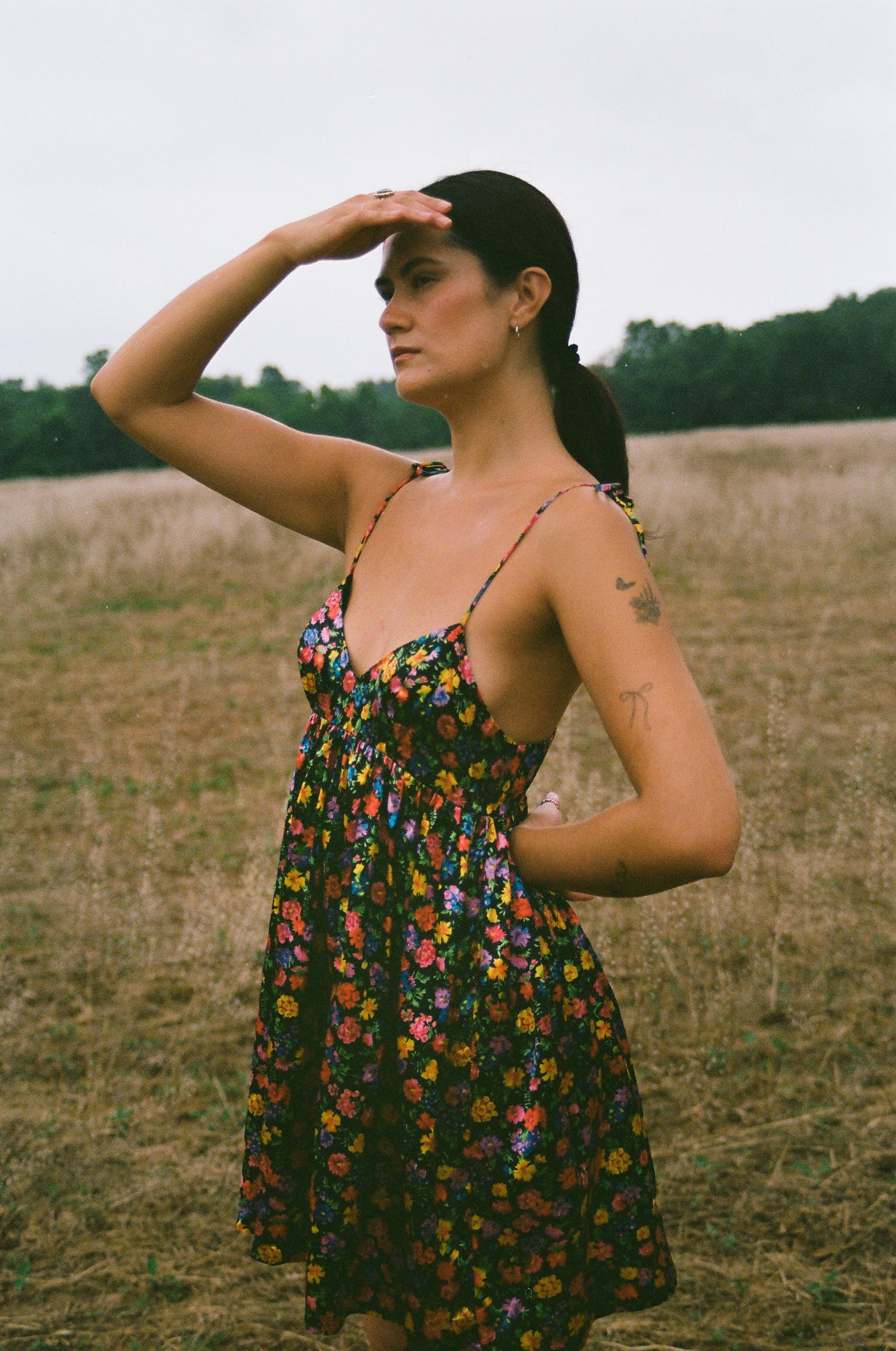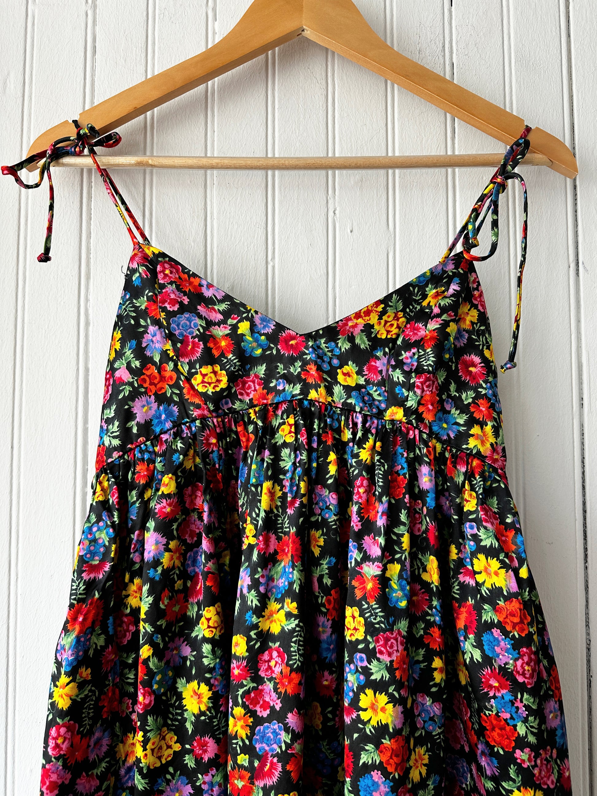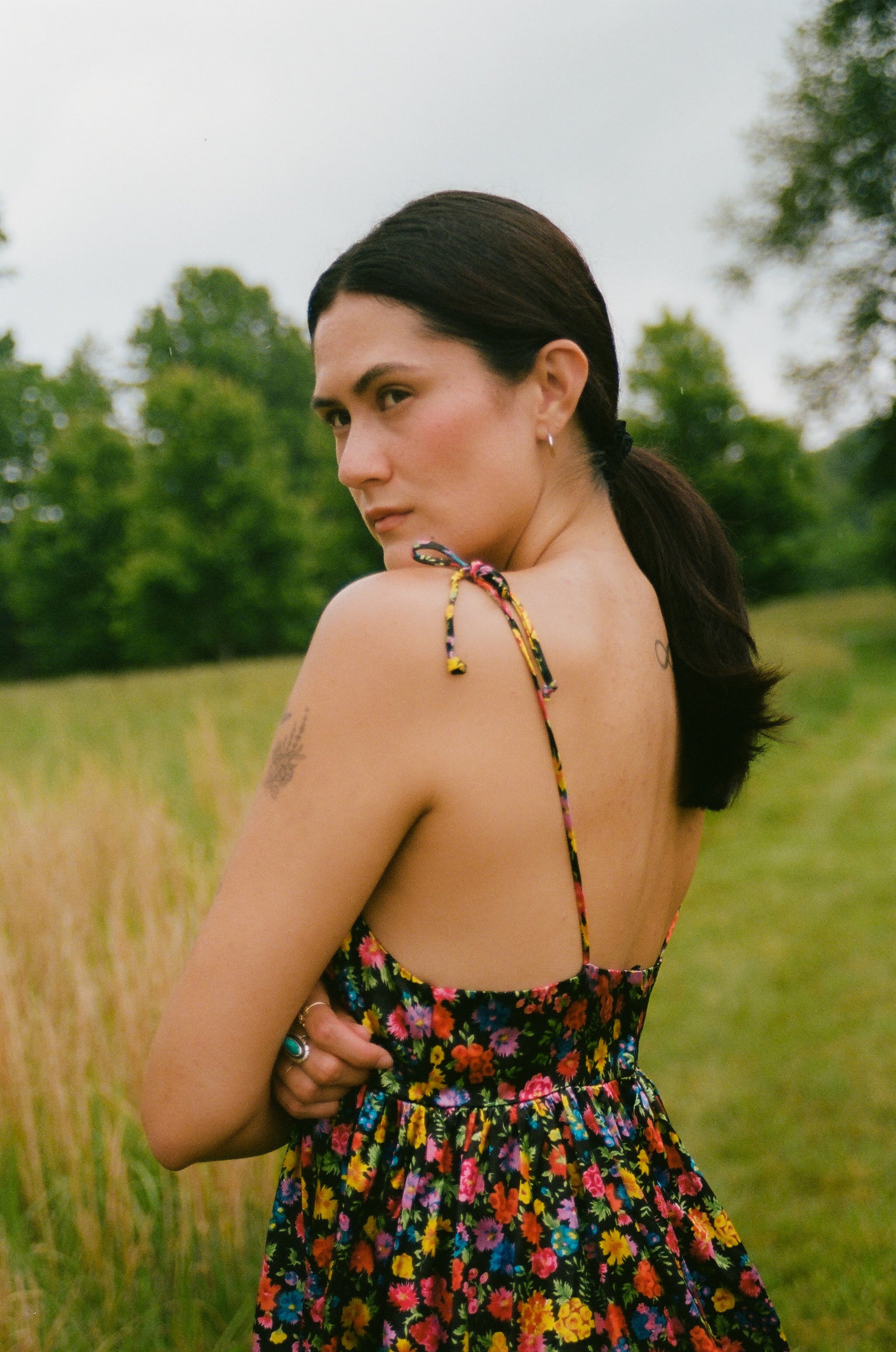 This piece is incredible--truly transcends era's but is an original 70's mini dress with vibrant floral print and tie straps along the shoulder and back zipper.