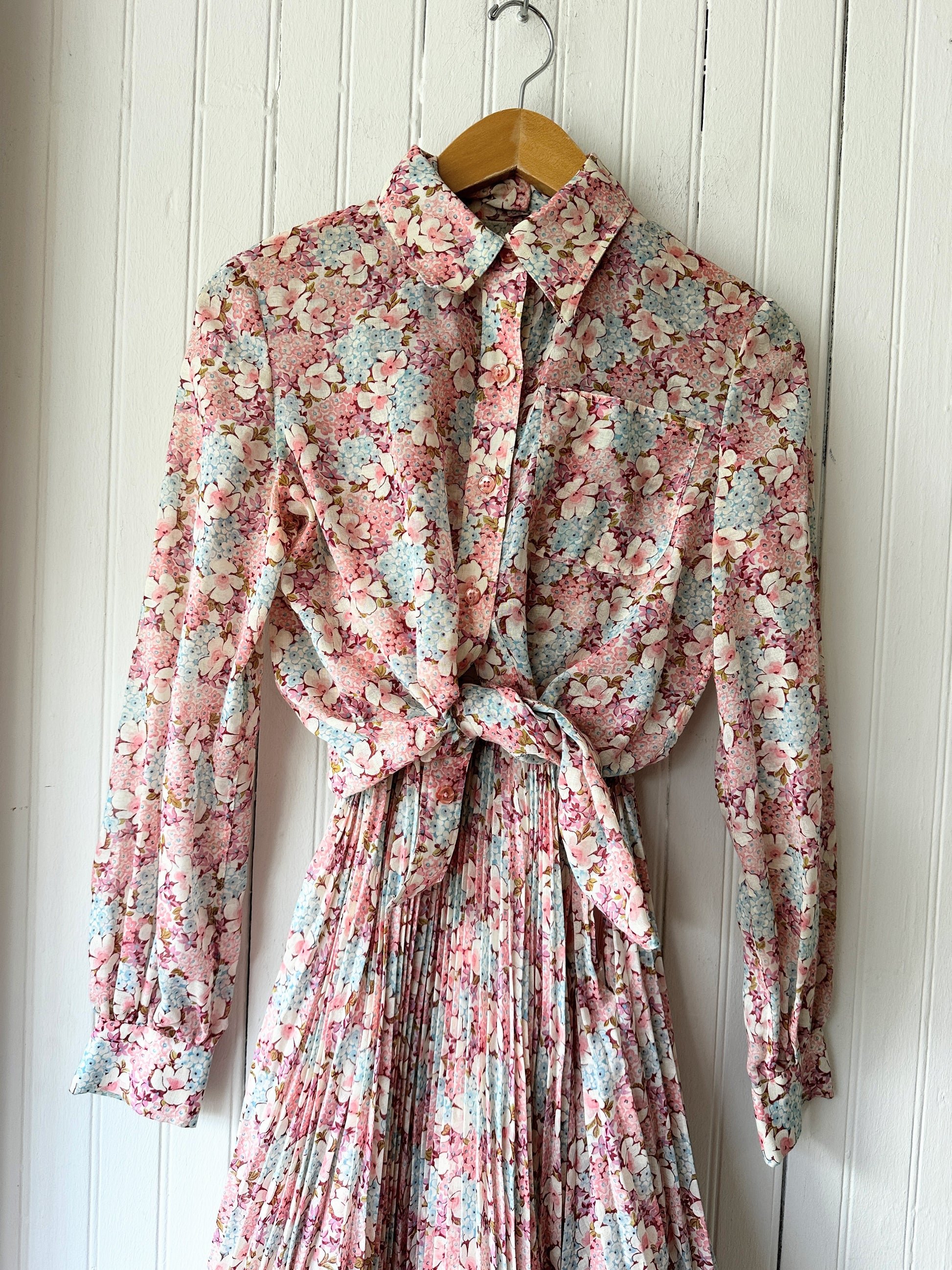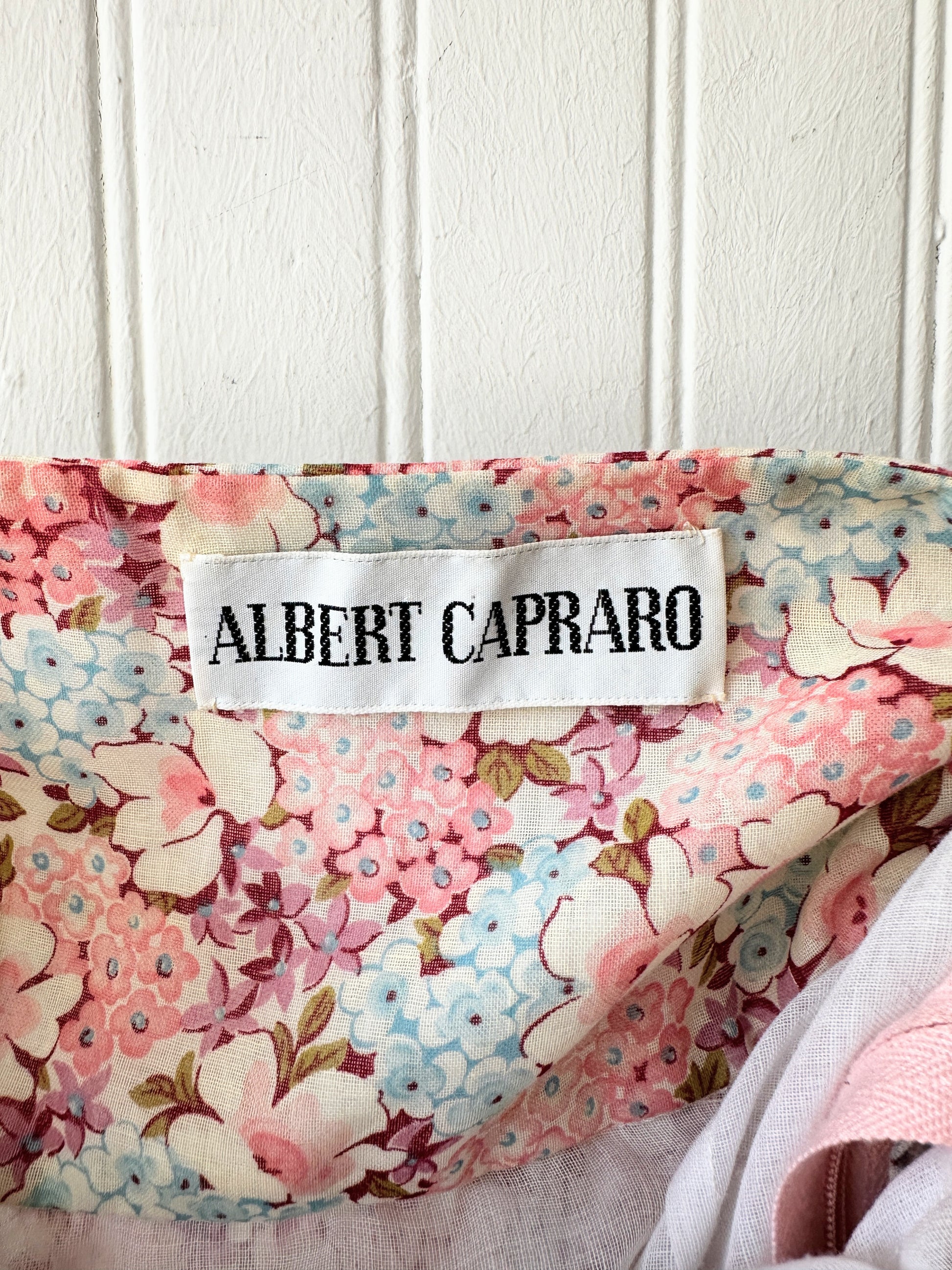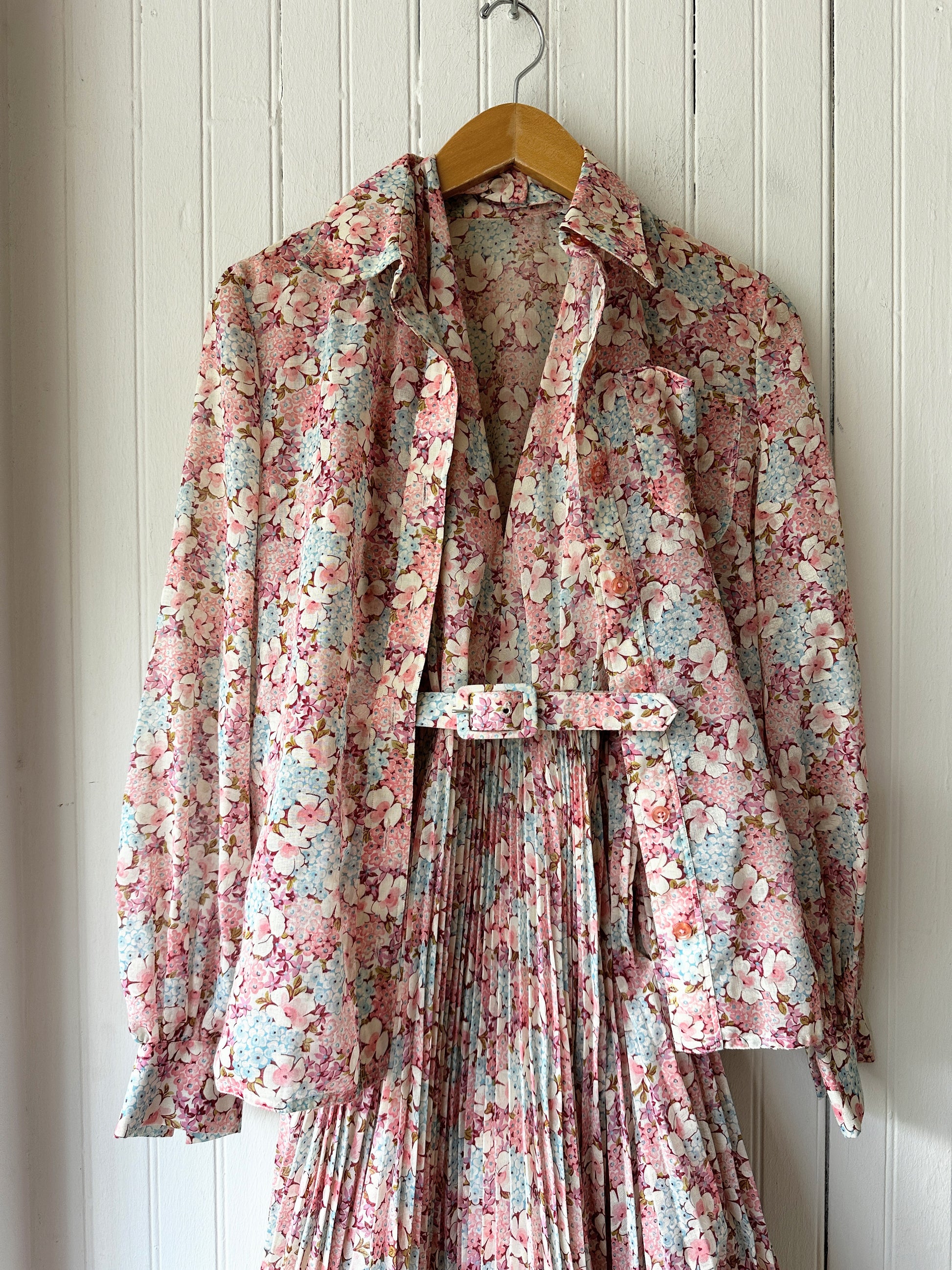 Truly breathtaking 3 piece Albert Capraro set, includes halter maxi dress with pleated skirt, belt, and button down shirt. Dress is double layered with a side zipper. This 70's set is in incredible condition and the floral print is stunning.